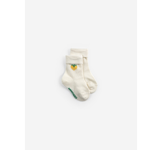 Zachte katoenen babysokjes. Set van 2 paar. 1 paar met geel en crèmewitte streepjes en het andere paar crèmewit met 1 gele aardbei bovenaan.