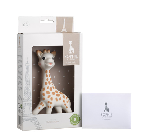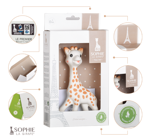 Sophie la Girafe werd geboren op 25 mei 1961 in Parijs en is van 100% natuurlijk rubber. Het eerste babyspeeltje waarmee uw baby al zijn zintuigen ontwikkelt.