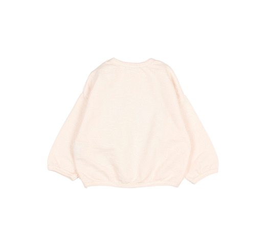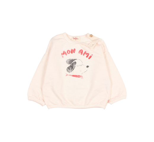 Zachte sweater van biologisch katoenen fleece met Mon Ami-motief op de borst. Ronde hals met houten knoopsluiting op de schouder.