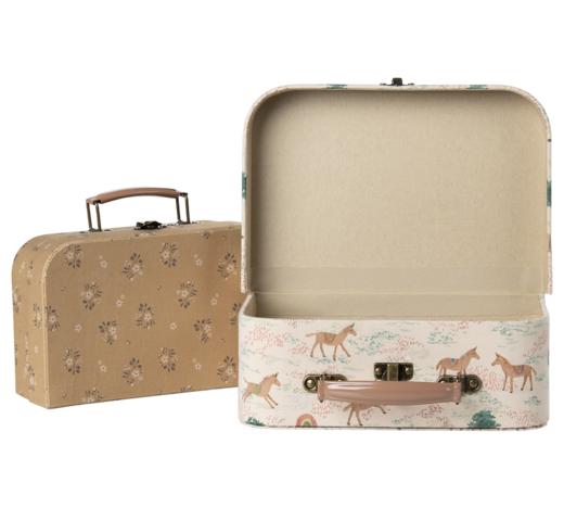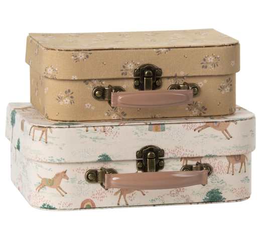 Een perfecte kofferset om al je favoriete spullen in op te bergen. Elke koffer is prachtig gestoffeerd met unieke Maileg-stoffen en heeft gekleurde metalen handgrepen. Deze set van 2 stuks is perfect voor zowel opslag als het meenemen van je favoriete speelgoed.