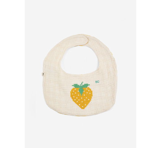 Offwhite slabbetje. Gevoerd met geel geruitte stof. Verstelbaar in maat. Sluit met springknoopje.