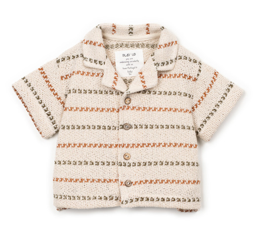Dit shirt is gemaakt van een mix van katoen en gerecycled katoen. Het bevat Re(Play)-garen, gemaakt van gerecycled industrieel afval. Het heeft een V-hals en kraag, korte mouwen, een opening aan de voorkant met kokosnootknopen en een gestreept patroon.