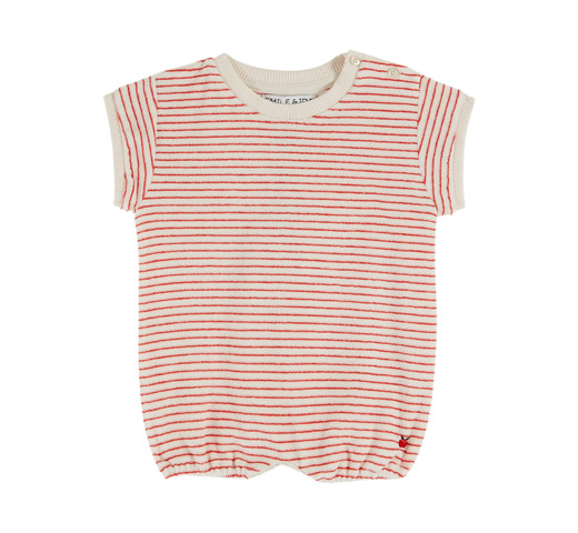 Witte playsuit van biologisch katoen en een fluweelmix met dunne papaverrode strepen.
