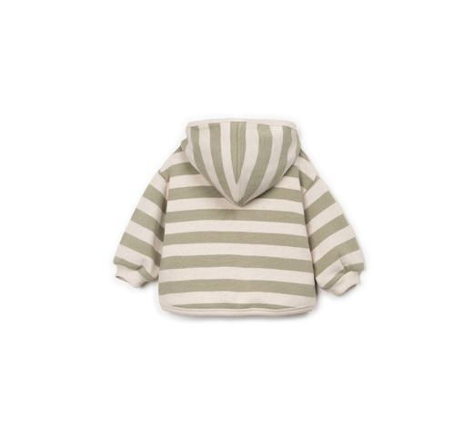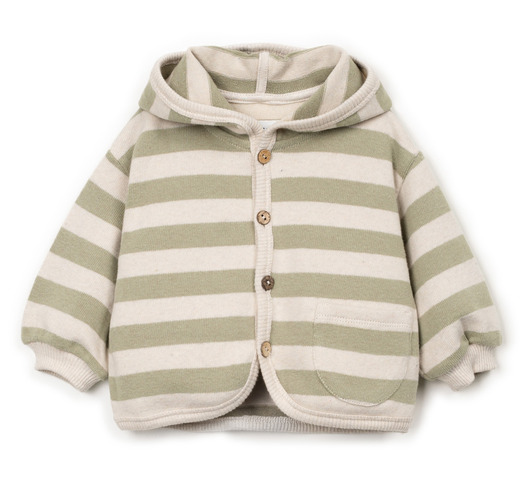 Deze jas is gemaakt van een stof, een mix van regeneratief en gerecycled katoen. Er is Re(Play)-garen in verwerkt, gemaakt van gerecycled industrieel afval. Deze jas met capuchon en lange mouwen heeft een opening aan de voorkant met kokosnootknopen, een voorzak en ons kenmerkende streepjespatroon.