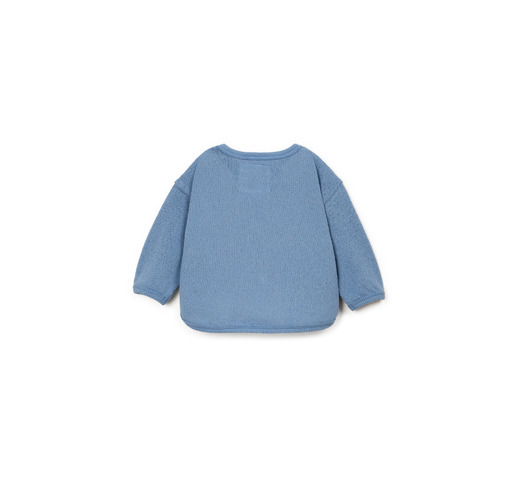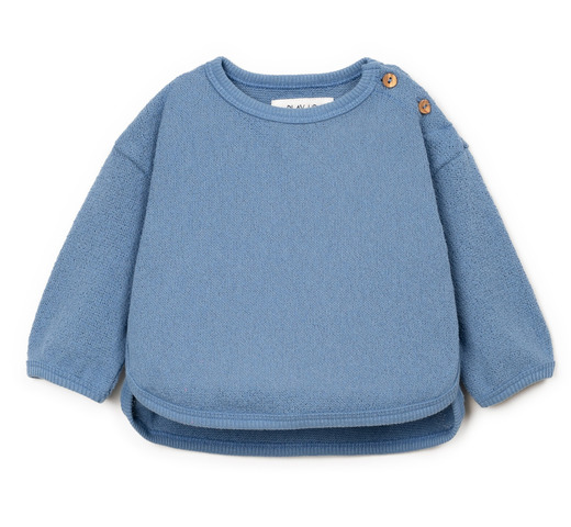 Deze blauwe trui is gemaakt van een mix van katoen, gerecycled polyester en gerecycled katoen. Er is Re(Play)-garen in verwerkt, dat is gemaakt van gerecycled industrieel afval. De trui heeft lange mouwen, een ronde hals en een open schouder met kokosnootknopen.