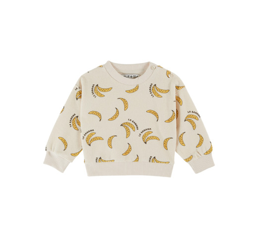 Crèmekleurige sweater van biologisch katoen en een fluweelmix met een bananenprint over de hele stof. Uitzonderlijk zachte stof, ronde hals, tonale ribboord bij de halslijn, manchetten en zoom. Knoopsluiting op de schouder voor babymaten.