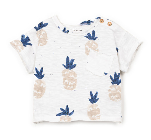Dit T-shirt is gemaakt van biologisch katoenen jersey en is wit. Het heeft korte mouwen, een ronde hals, schouderopeningen met kokosnootknopen, een opgestikte zak op de borst en onze kenmerkende ananasprint.