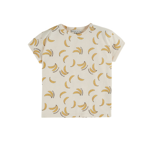 Crèmekleurig T-shirt van biologisch katoenen jersey met een all-over print van kleine banaantjes. Recht model, ronde hals afgewerkt met bananen-katoenjersey, korte mouwen, dubbele stiksels rond de zoom en aan de onderkant van de korte mouwen.