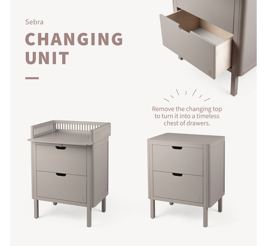 Deze stijlvolle verzorgingstafel is een 2-in-1-ontwerp, en kan dus heel eenvoudig omgebouwd worden tot een opbergkast. Combineert mooi met het Sebra bed uit dezelfde collectie.