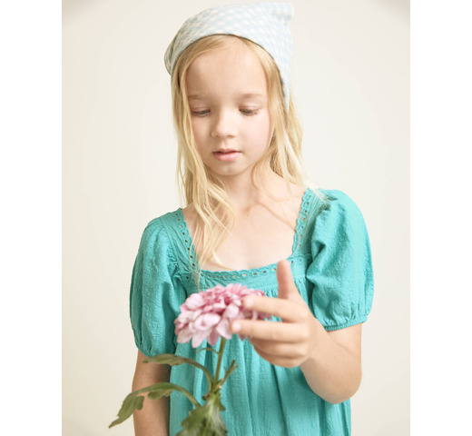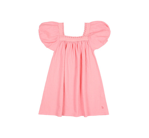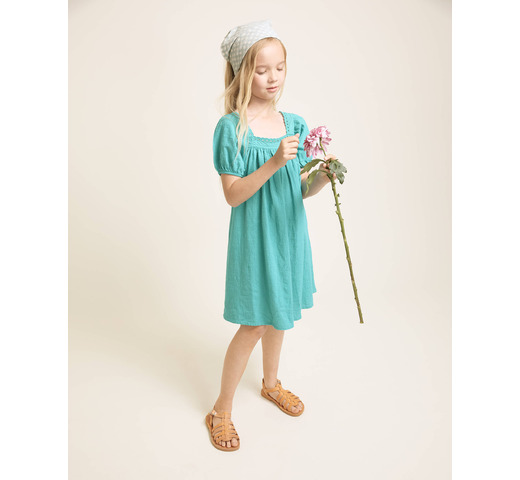 Jurk van biologisch katoen met textuur. Vierkante halslijn met kanten details. Wijde pofmouwen met elastische afwerking. Uitlopende rok. Contrasterend geborduurd detail aan de zijkant van de zoom.