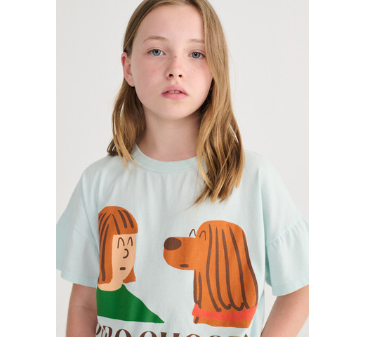 Lichtblauw T-shirt. Met korte mouwen, een losse pasvorm en een ronde hals.