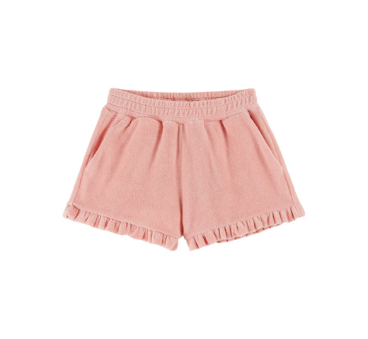 Blossomroze short van katoen en polyester badstof. In zachte en comfortabele stof, met elastische tailleband, twee zijzakken, volantafwerking onderaan de bovenbenen.