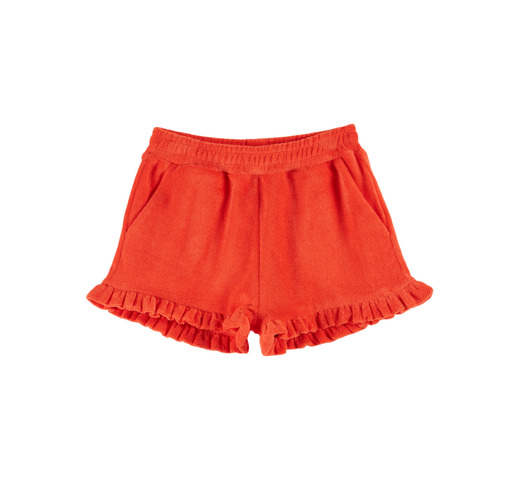 Rode short van katoen en polyester badstof. In zachte en comfortabele stof, met elastische tailleband, twee zijzakken, volantafwerking onderaan de bovenbenen.