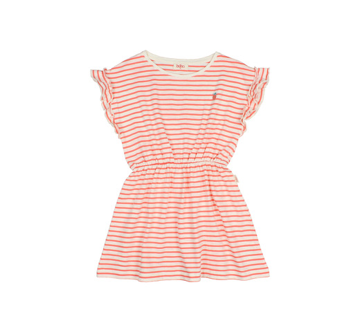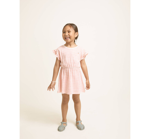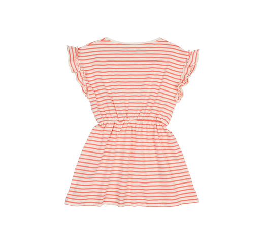 Gestreepte jurk van biologisch katoen. Korte mouwen met ruches. Contrasterende ronde hals in ecru. Geborduurd detail op de borst. Elastische taille.