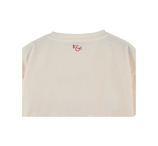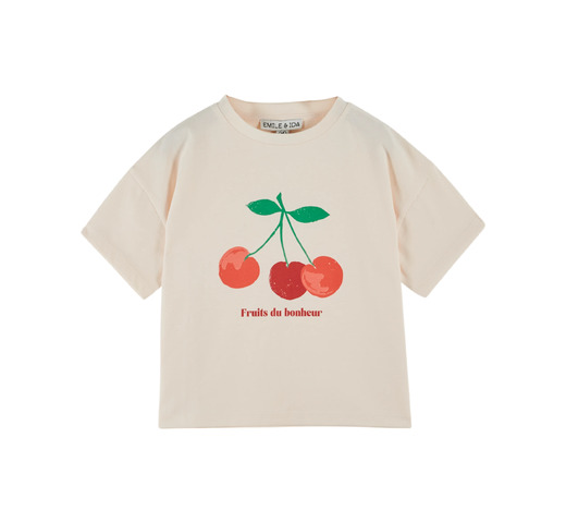 Crèmekleurig T-shirt van biologisch katoenen jersey met een boeket rode kersen op de borst. Recht model, ronde hals, korte mouwen, geribbelde halslijn, dubbele stiksels bij de manchetten en zoom.