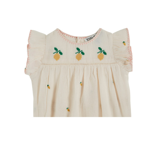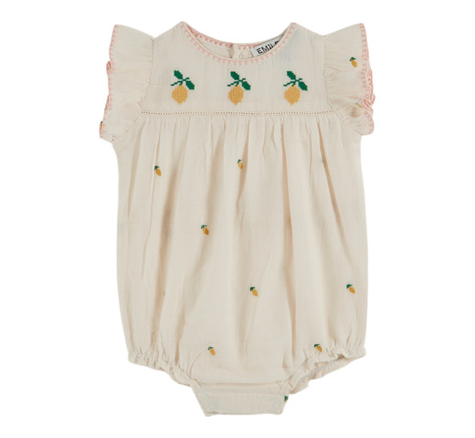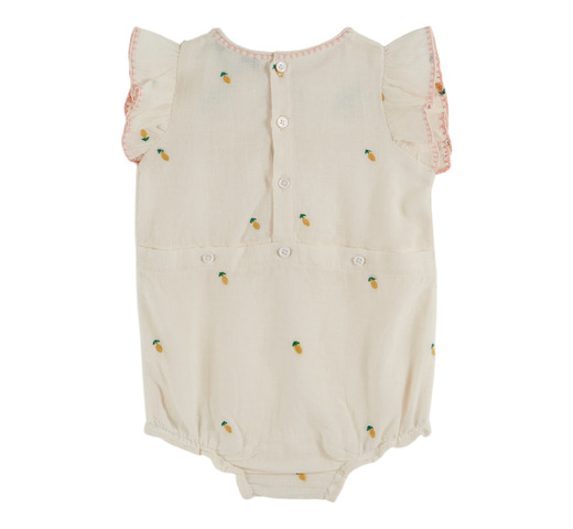 Crèmekleurige, zachte romper van biologisch katoenen gaas, volledig geborduurd met gele citroenen. De halslijn en ruches zijn versierd met roze satijnsteekborduurwerk, en op het schouderstuk zijn drie citroenen geborduurd met kruissteek, vervaardigd door Indiase ambachtslieden. Ronde halslijn. Ruches rond de armsgaten. Knoopsluiting aan de achterkant. Elastische beenopeningen. Drukknoopsluiting in het kruis. Volledig gevoerd.