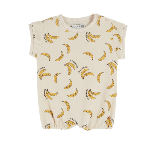 Playsuit van biologisch katoen en een fluweelmix met banane allover print.