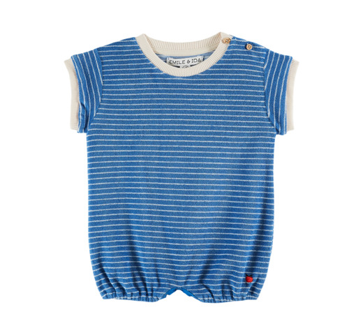 Uitzonderlijk zachte stof, crèmekleurige geribbelde ronde hals en korte mouwen, knoopsluiting bij de schouder, elastische beenopeningen, drukknoopsluiting in het kruis.