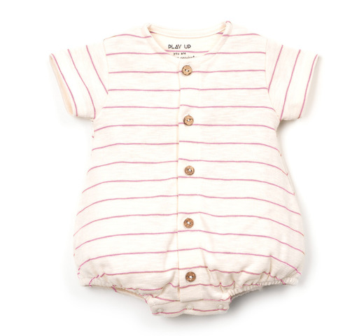 Deze jumpsuit is gemaakt van crèmekleurig biologisch katoen. Hij heeft korte mouwen, een ronde halslijn en een wijdvallende pasvorm. De jumpsuit heeft een opening aan de voorkant met kokosnootknopen en een kruisopening met nikkelvrije metalen drukknopen en een gestreept patroon.