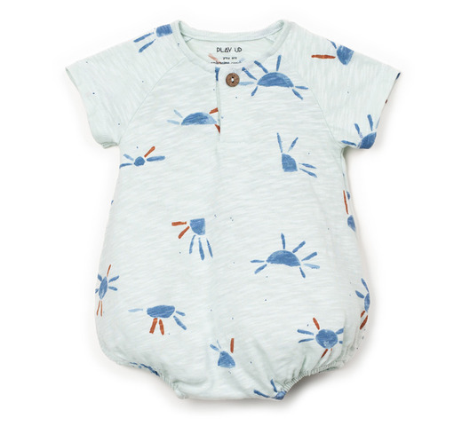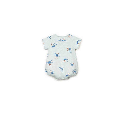 Deze jumpsuit is gemaakt van biologisch katoenen jersey in een waterblauwe kleur. Hij heeft korte mouwen, een ronde hals, een pofmodel, een opening aan de voorkant met houten knopen, beenopeningen met nikkelvrije metalen drukknopen en een zonneprint.