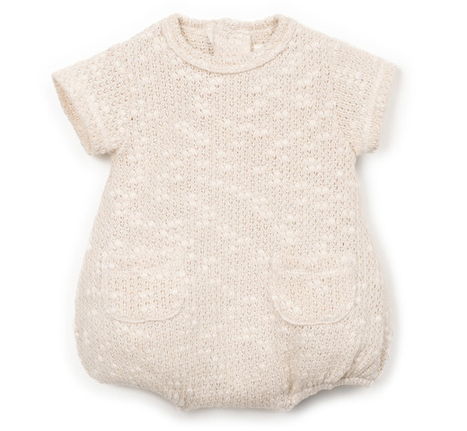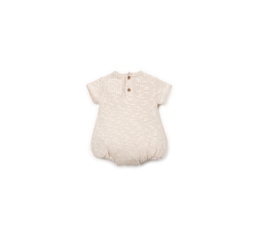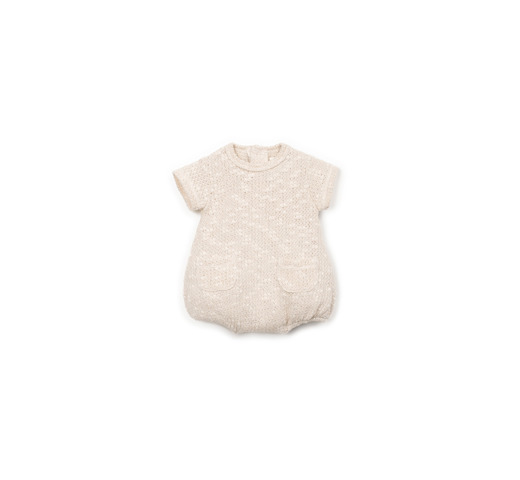 Deze jumpsuit is gemaakt van een mix van katoen en gerecycled katoen in een natuurlijke kleur. Er is Re(Play)-garen in verwerkt, gemaakt van gerecycled industrieel afval. De jumpsuit heeft korte mouwen, een ronde hals en een wijdvallend silhouet. De achterkant is voorzien van een opening met kokosnootknopen en het kruis heeft een opening met nikkelvrije metalen drukknopen.
