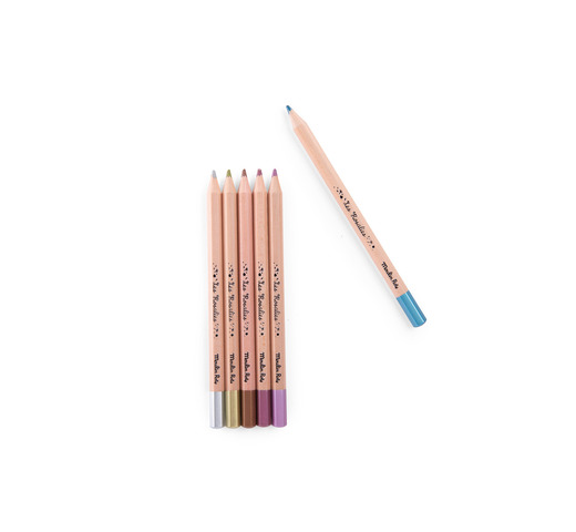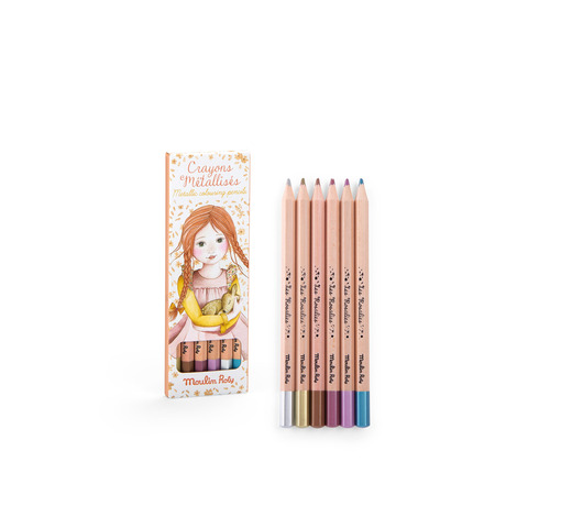 6 Les Rosalies metallic kleurpotloden, met een zachte stift om je tekeningen en kleurplaten te verlichten. Om het metallic effect te accentueren, kies je donker papier.