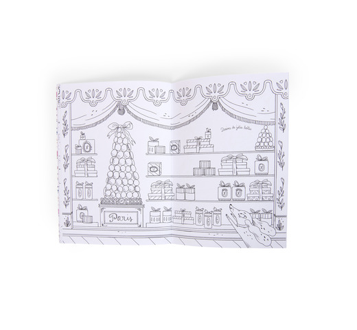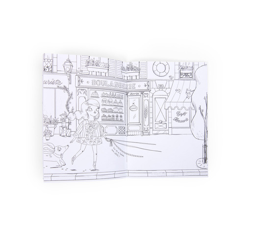 Een kleurboek met een omslag in poederachtige kleuren, met een charmant portret van Madame Constance, omringd door bloemmotieven en de hele wereld van Parijs in delicate en verfijnde zwarte potloodtekeningen van Lucille Michieli.