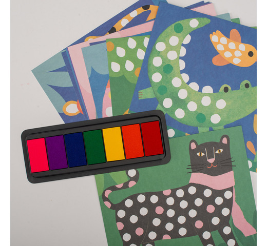 •Inhoud: 10 illustraties, 1 tampon met vingerverf in 7 kleuren