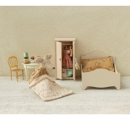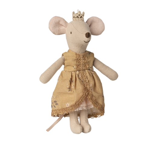 Een echte prinsessenmuis in een grote-zus-formaat. Ze is gekleed in haar mooiste jurk met prachtige details en een gouden kroon. Ze past perfect in het Maileg kasteel.