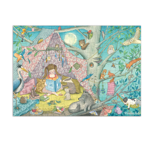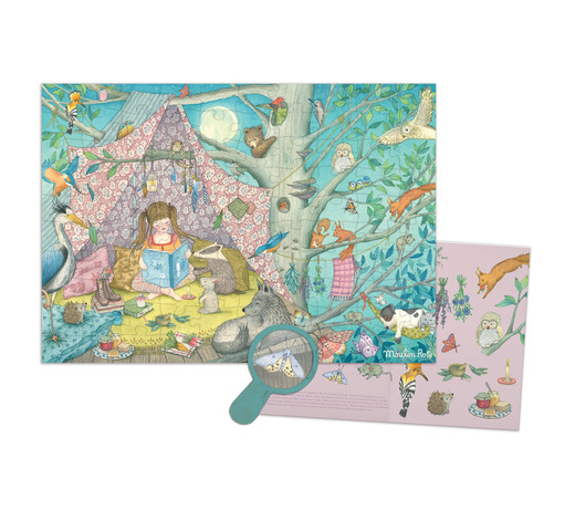 Observatiepuzzel van 100 stukjes, De Geheime Hut, Les Rosalies-collectie. Eenmaal in elkaar gezet, kun je spelenderwijs de dieren en voorwerpen vinden die in de scène verborgen zijn, waarbij je het vergrootglas als hulpmiddel gebruikt. Bevat 1 modelposter. Vanaf 5 jaar.