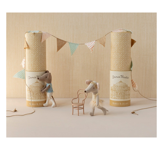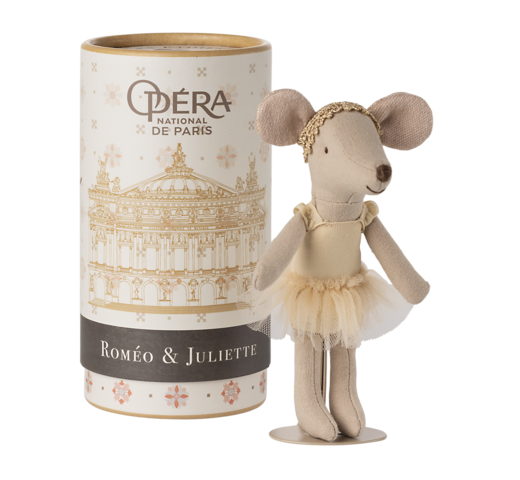 Een echte balletdanseres. De muis wordt geleverd in een mooie tube met een standaard erin, zodat je de danseres thuis kunt neerzetten.