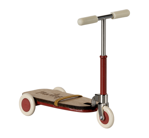 Een kickboard met houten details. Het kickboard heeft een metalen staafje in het stuur, waardoor muizen met magneten in hun handen op het board kunnen blijven staan. Aan het board zit een klein elastiekje bevestigd, dat de voeten tijdens het rijden op het board houdt.
