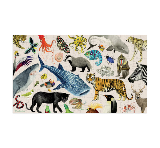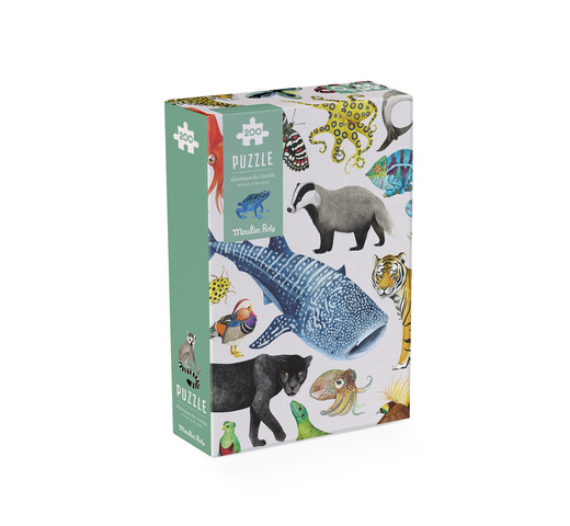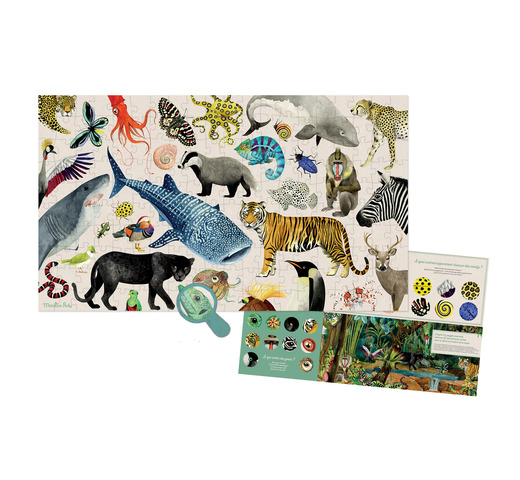 Observatiepuzzel van 200 stukjes, Dieren van de Wereld. Identificeer, zodra de puzzel in elkaar is gezet, bij welke dieren deze patronen horen? Bij welke dieren horen deze ogen? Zoek met plezier de dieren die verstopt zitten in de scène op de poster, gebruik daarbij het vergrootglas.